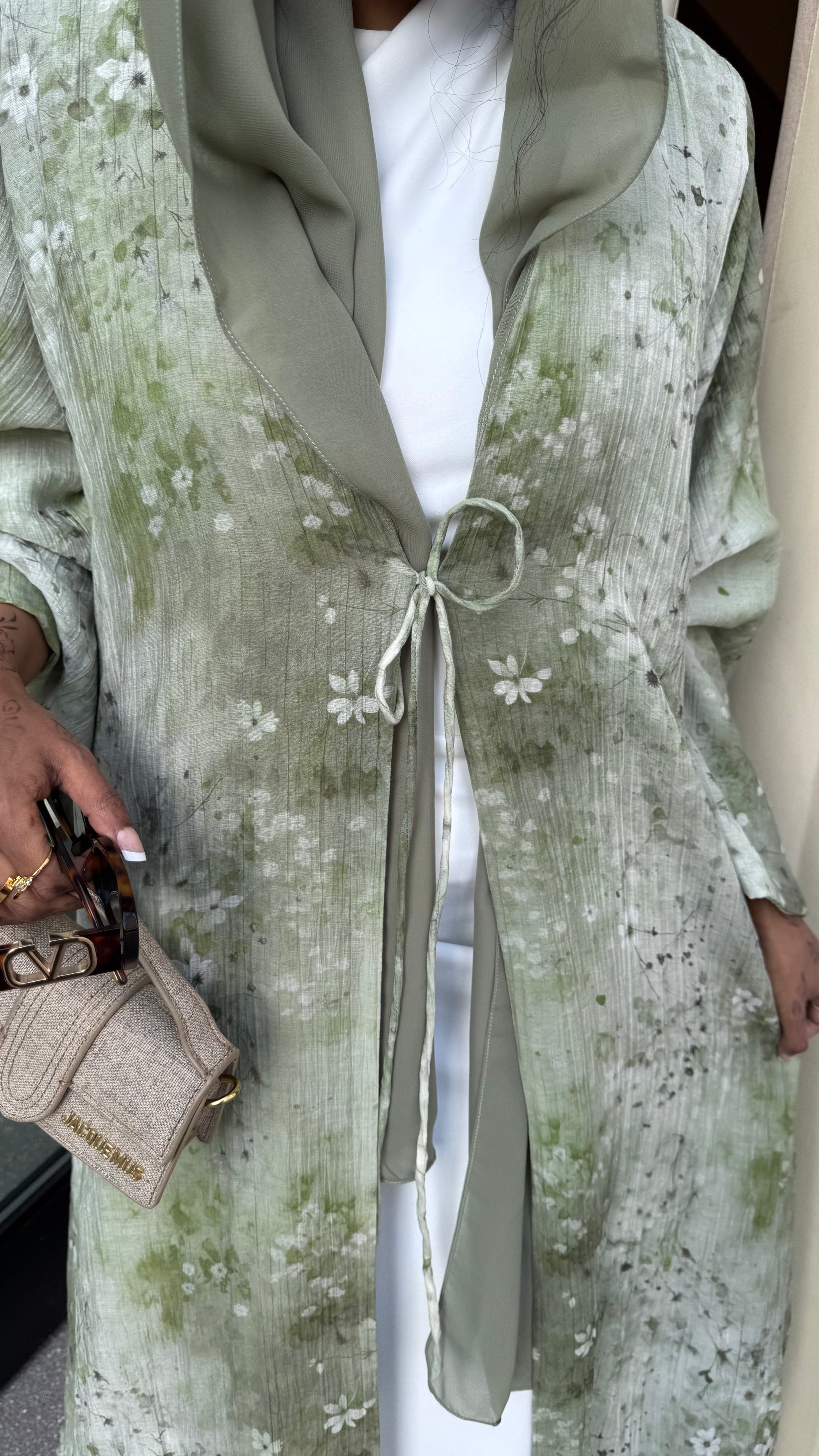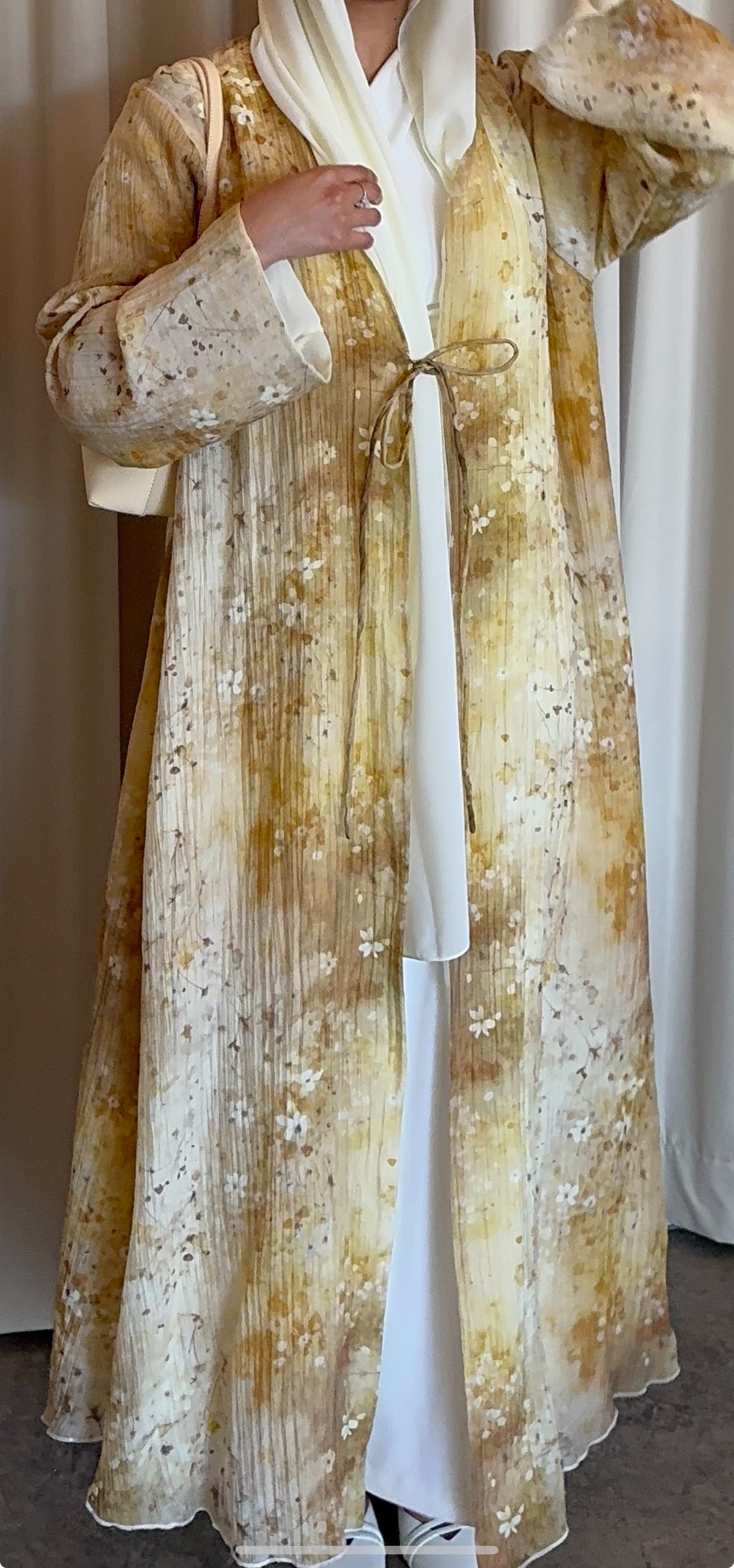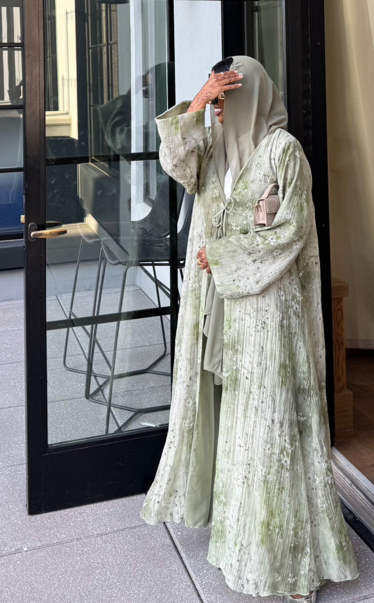 This abaya gives you two looks in one. One side has a soft floral print, while the other is plain matching the color of the hijab for a classic style. Finished with double stitching and a front tie to close. Sleeves are wide cut.