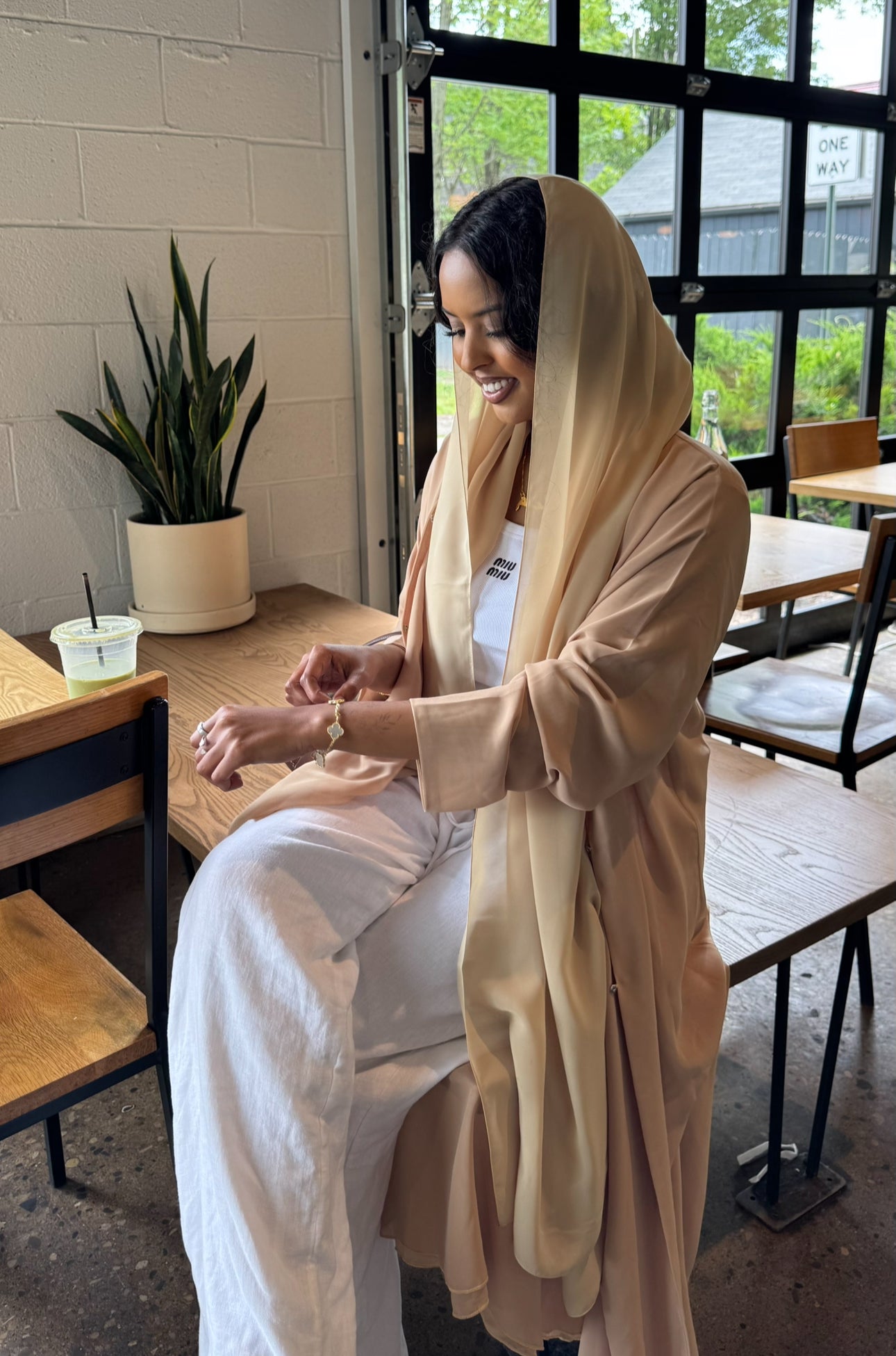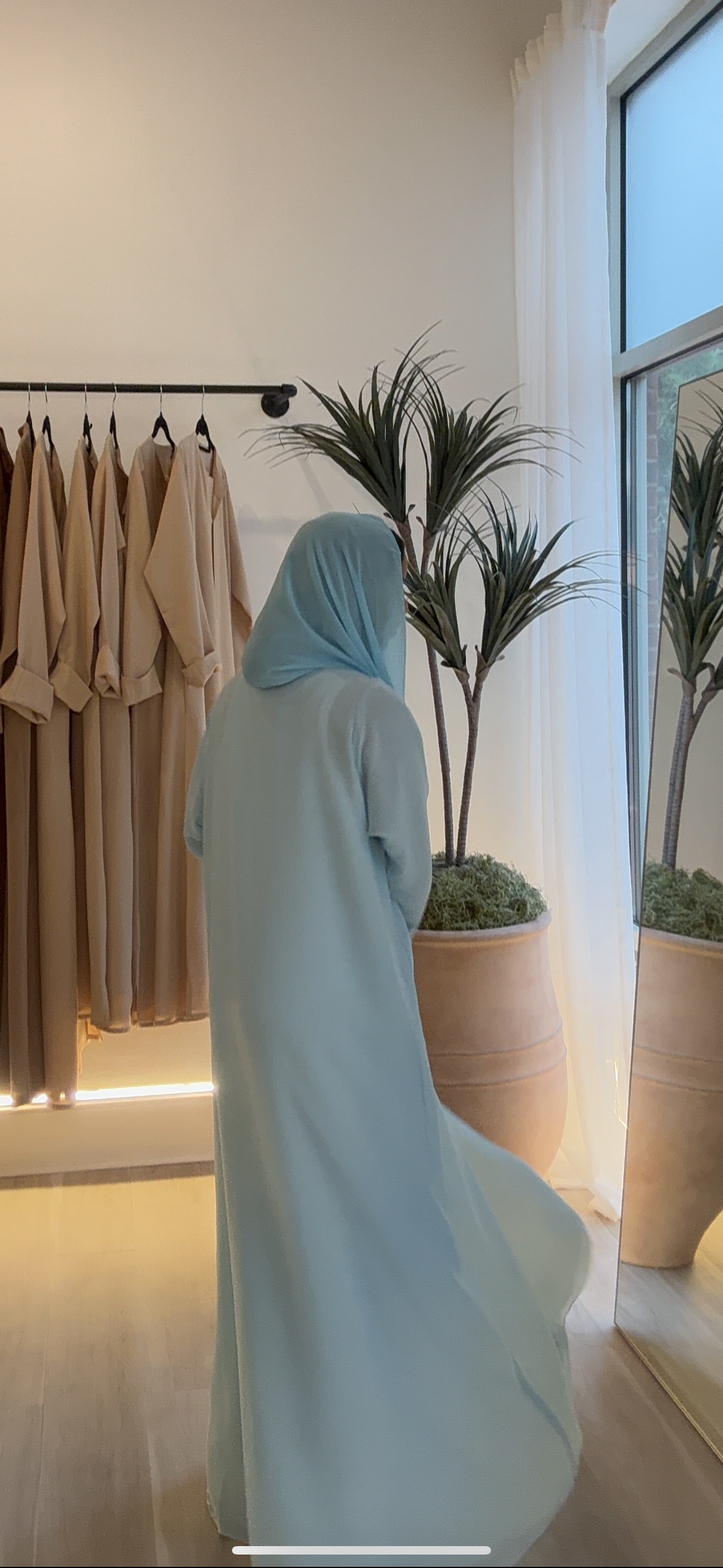 A classic open abaya with a wide umbrella bottom. Cut from a soft chiffon material. Double layered.