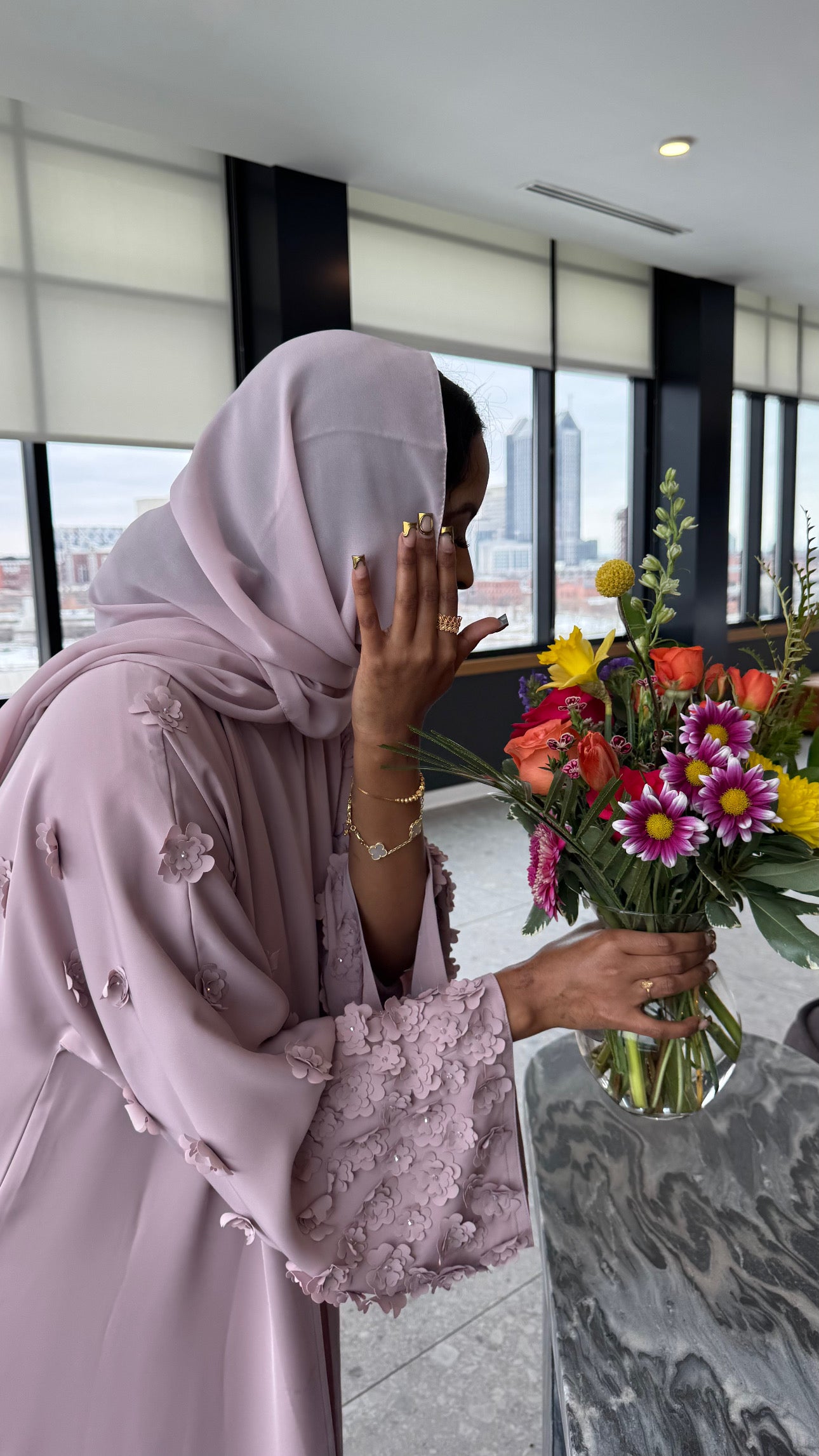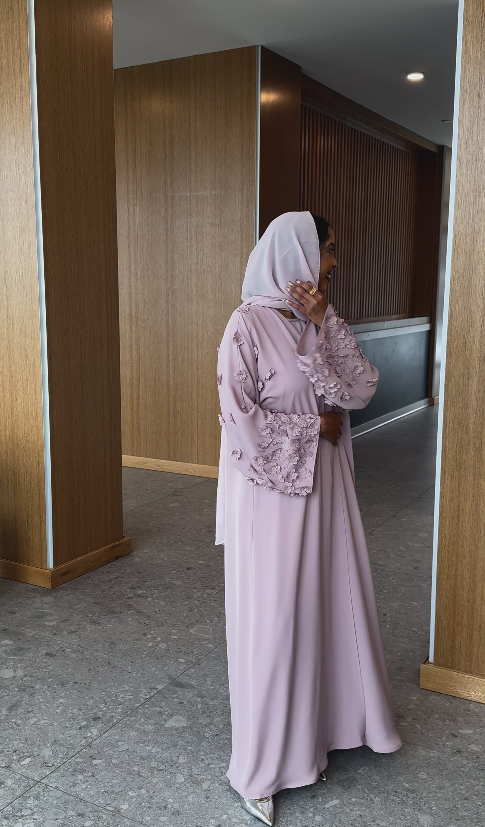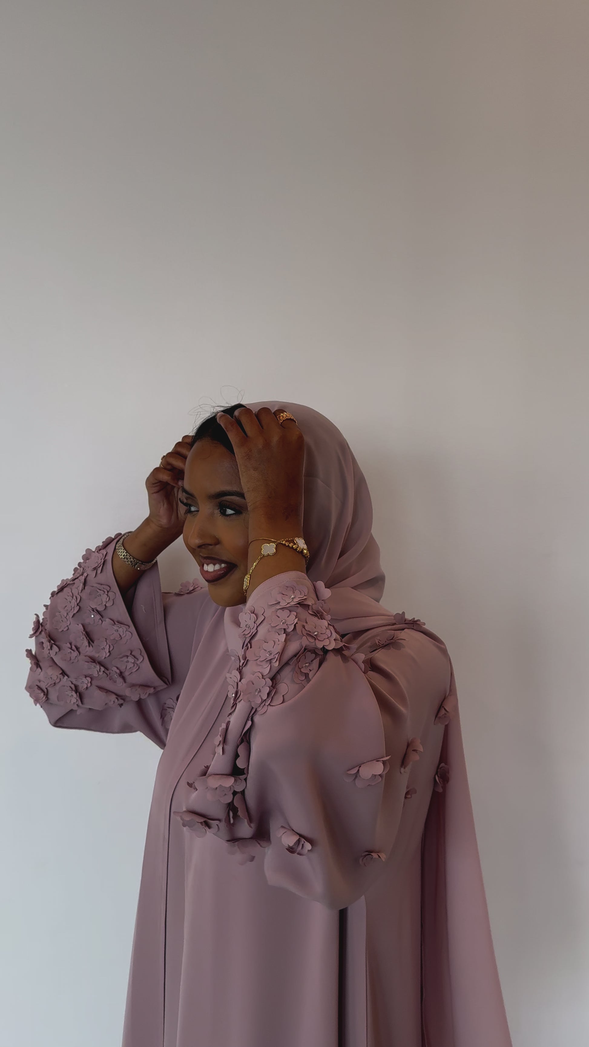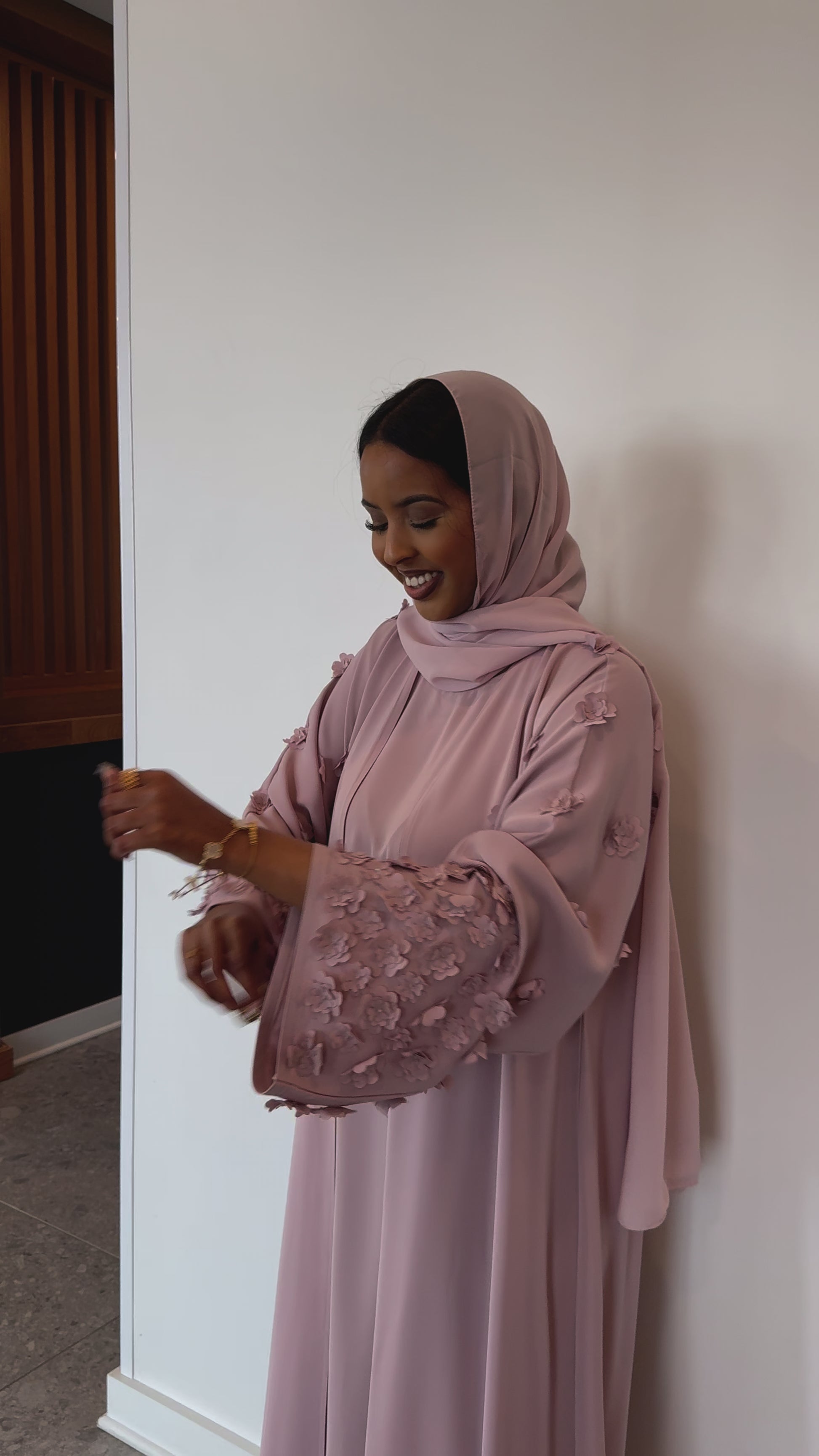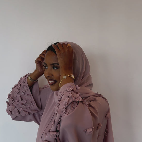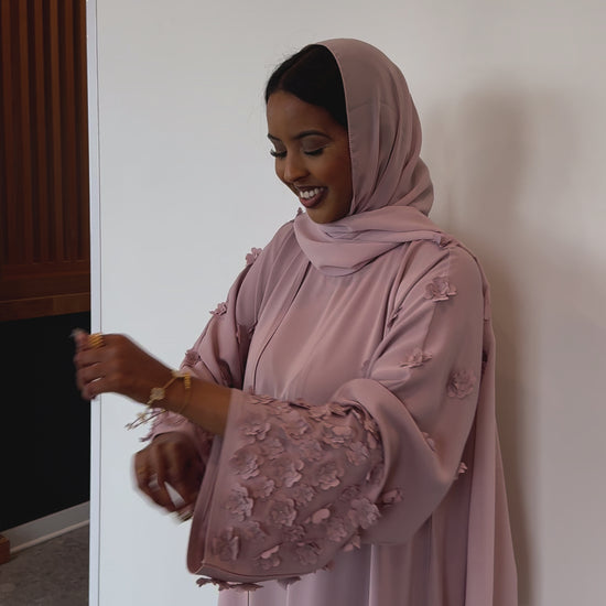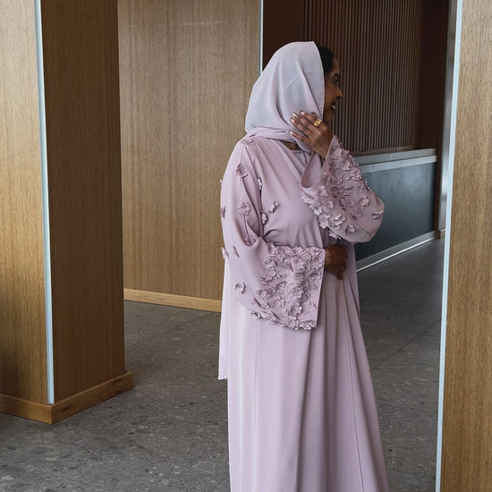 This beautiful open abaya features hand stitched floral details and is made from a soft, lightweight material. *Dress included*