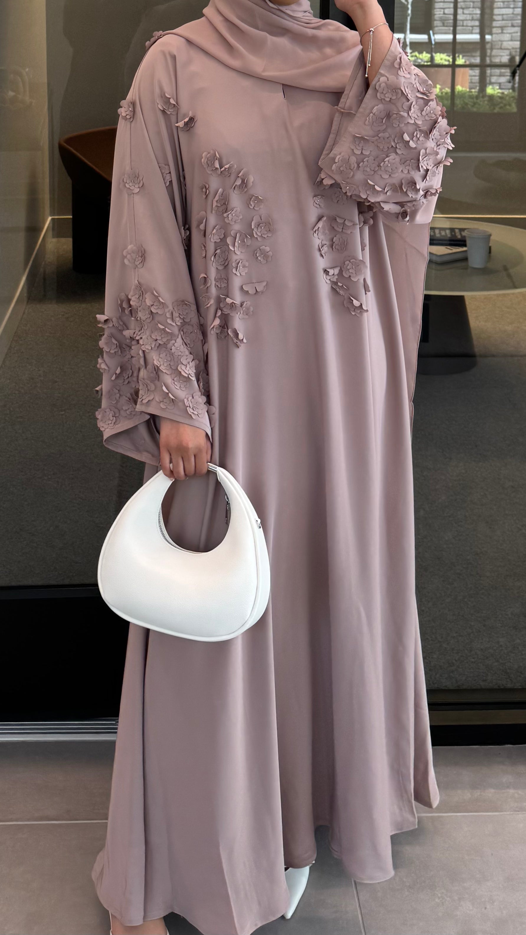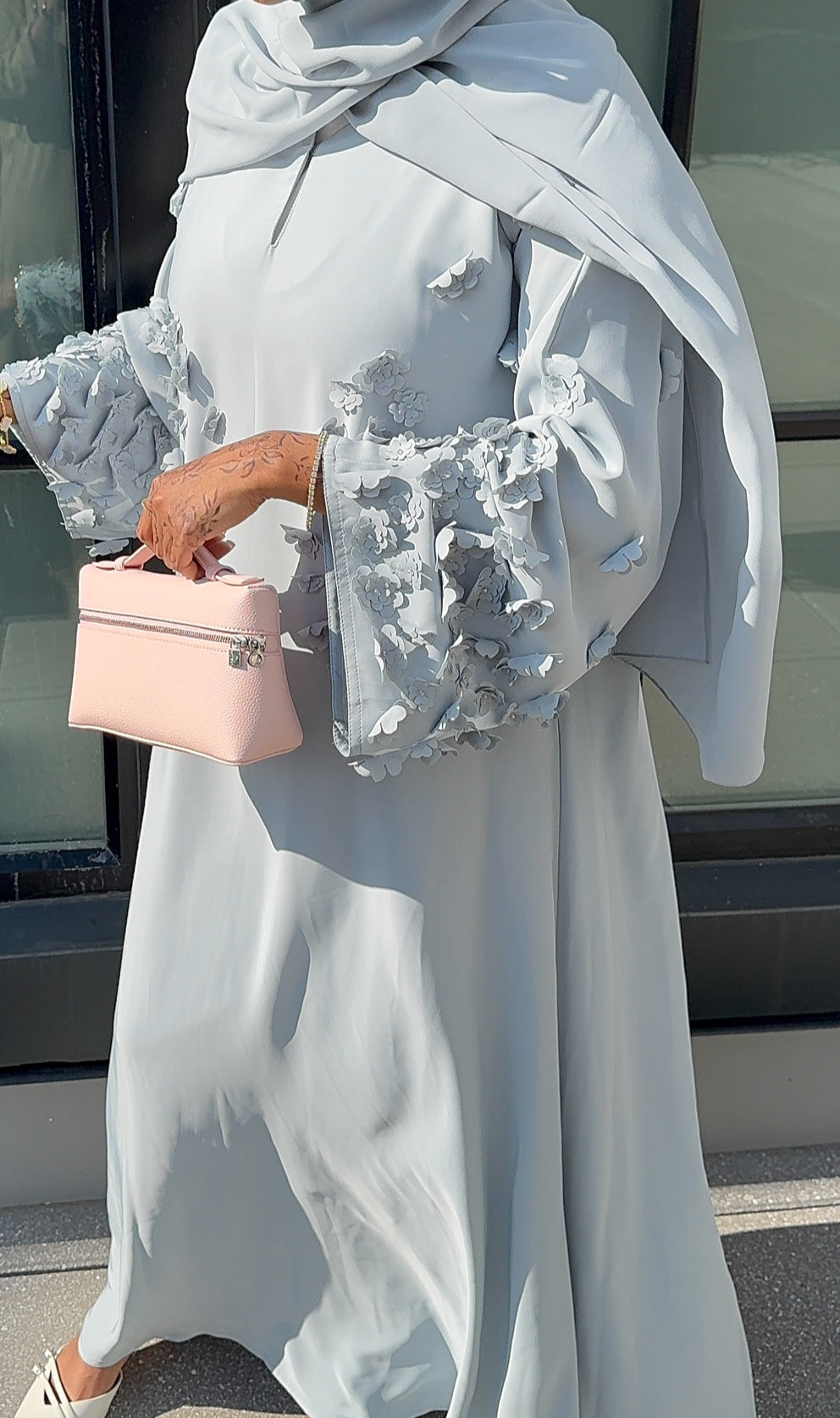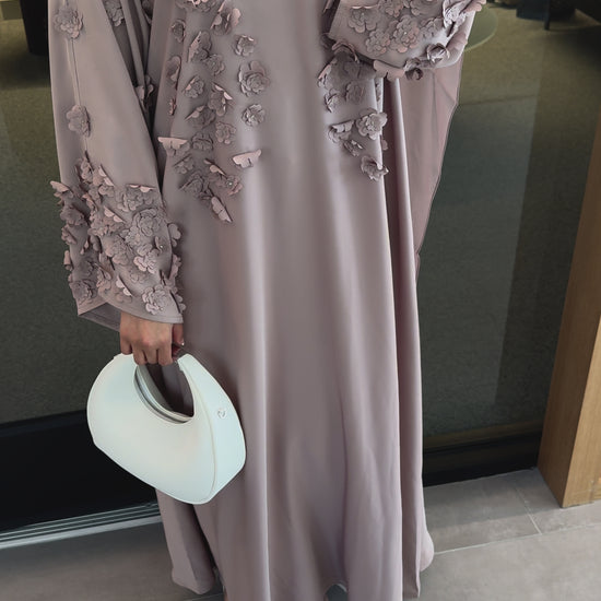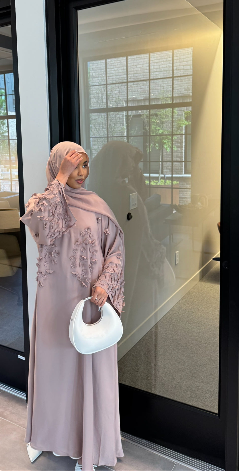 A closed abaya, with hand stitched floral cut detailing around the sleeves and front. Free size fit. Sleeves are wide cut.