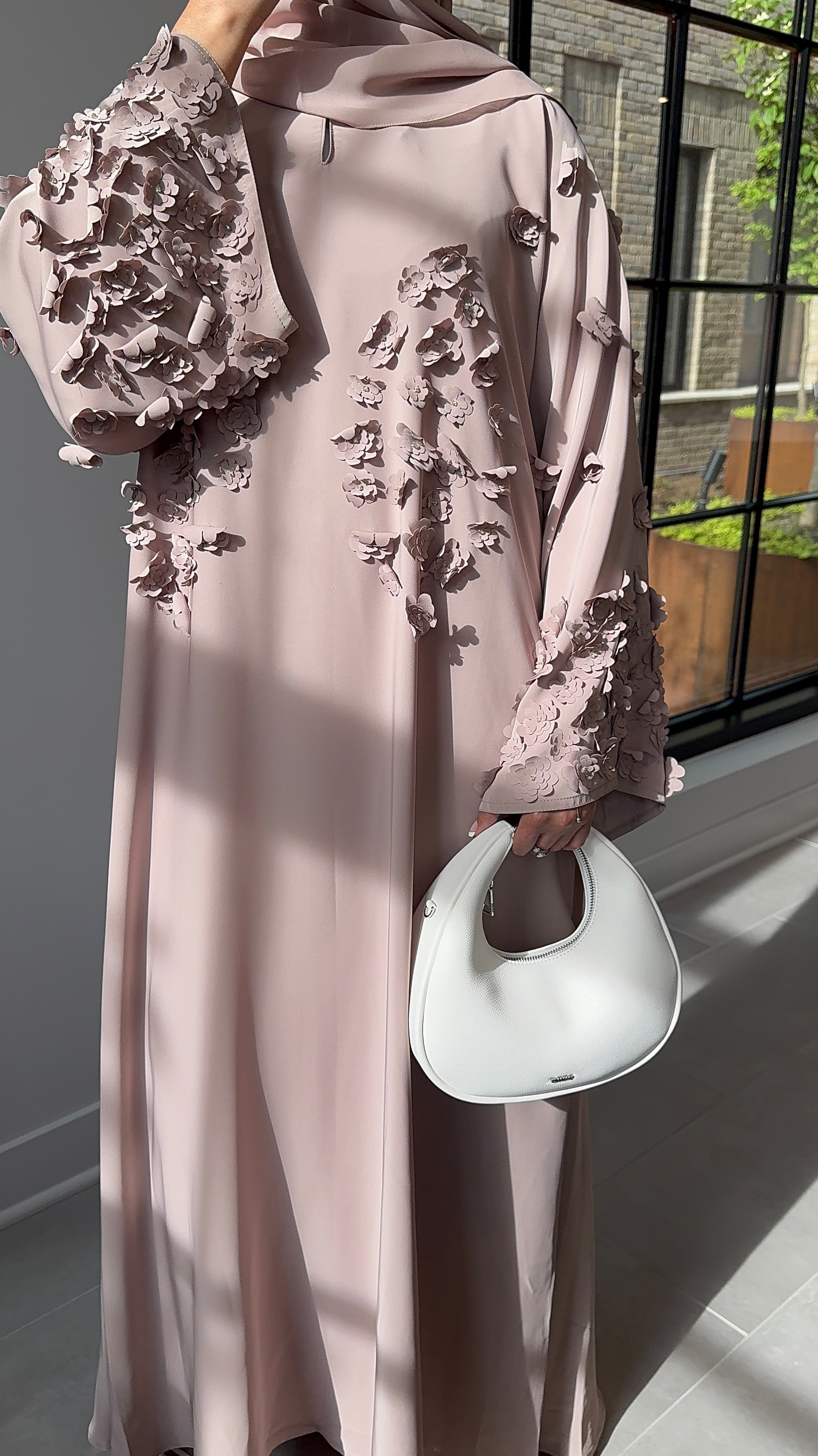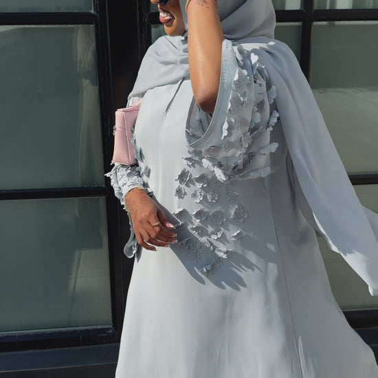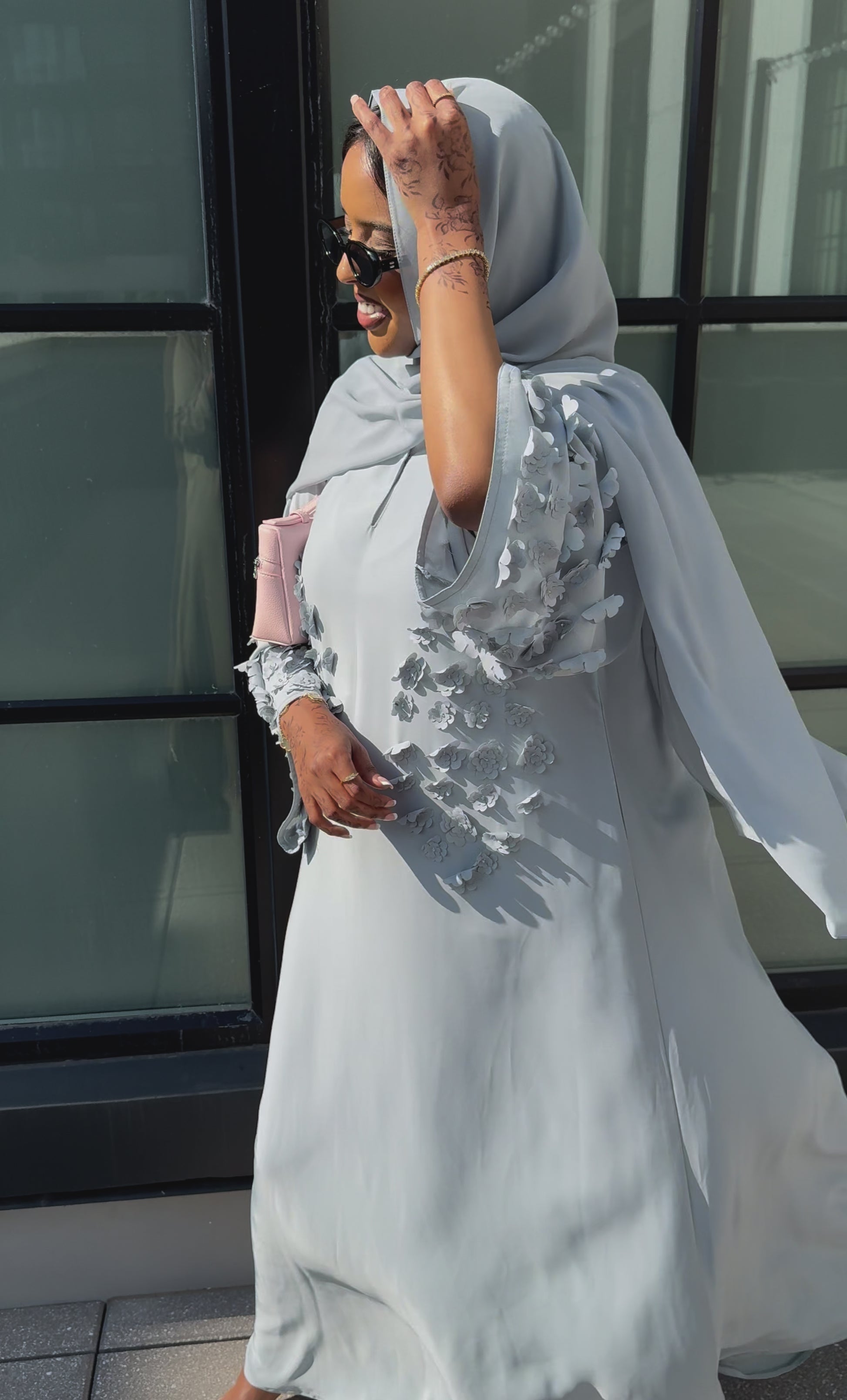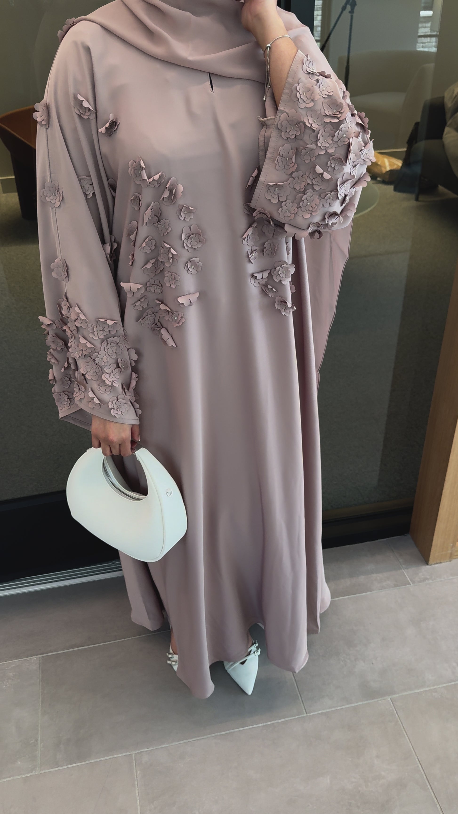 A closed abaya, with hand stitched floral cut detailing around the sleeves and front. Free size fit. Sleeves are wide cut.