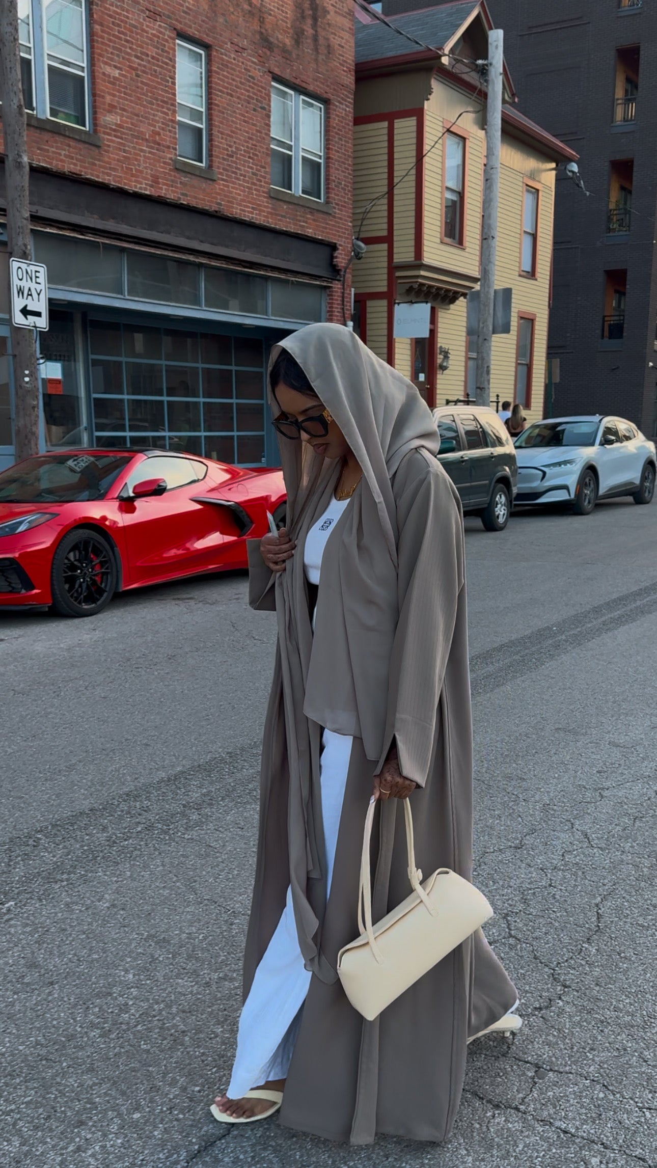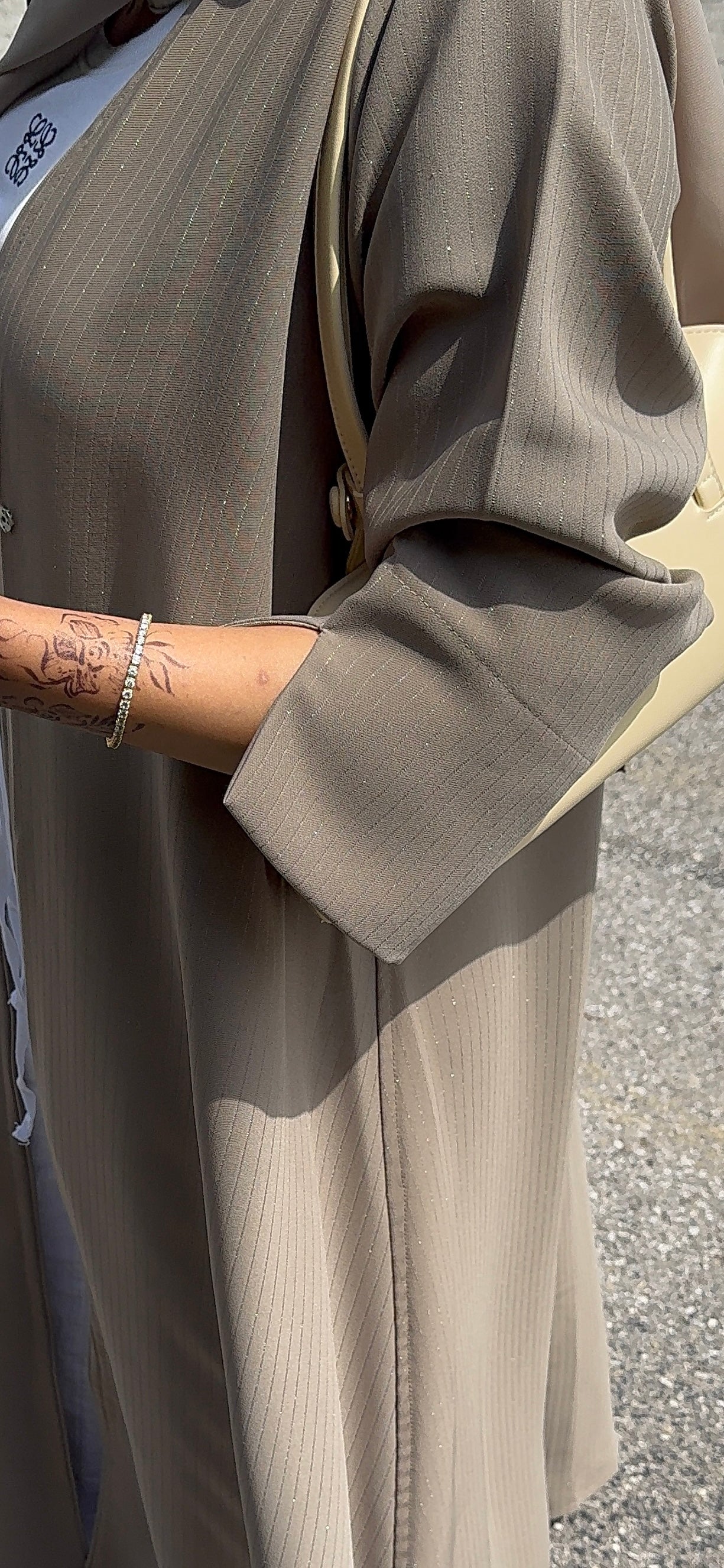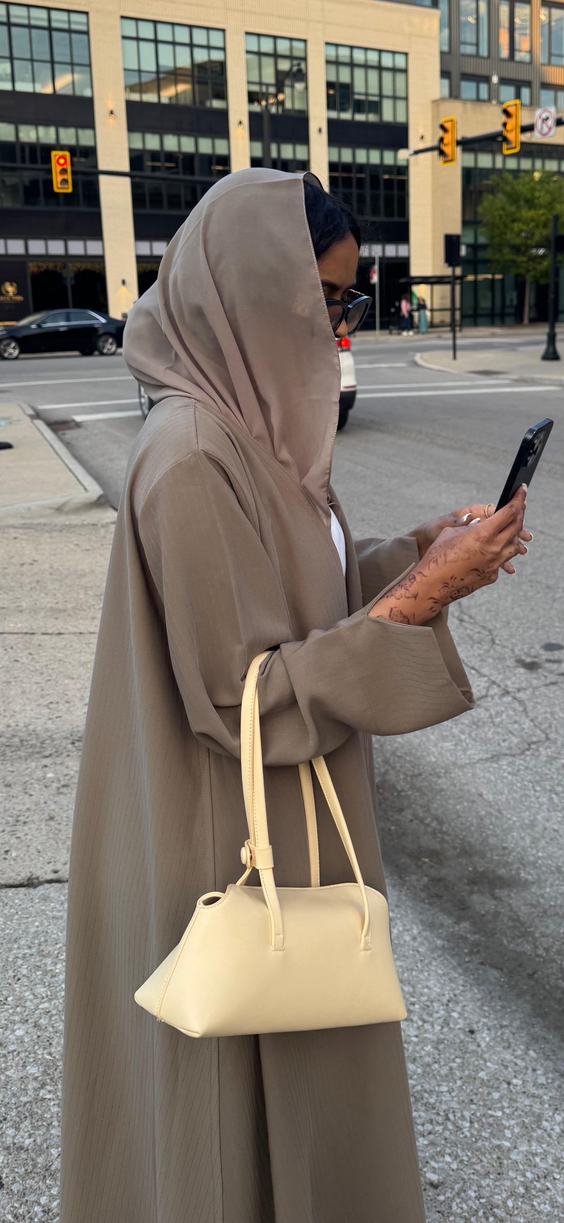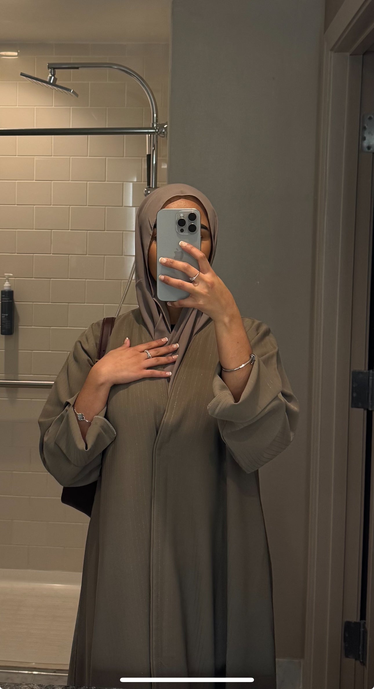 A high quality crepe abaya with a flowing silhouette. The fabric is designed with ultra-fine, tone on tone vertical stripes that blend seamlessly into the fabric, barely there detail visible only up close. The finish has very low shimmer on the stripes area, giving it an elegant look.