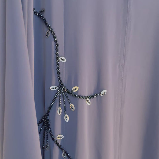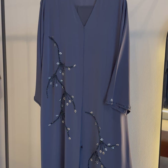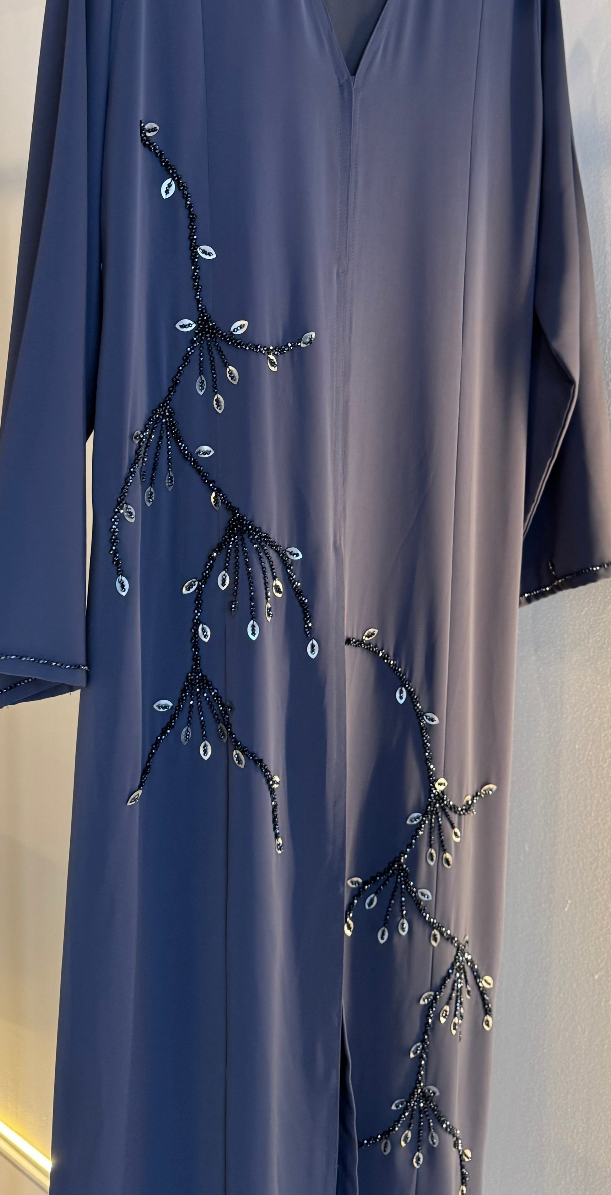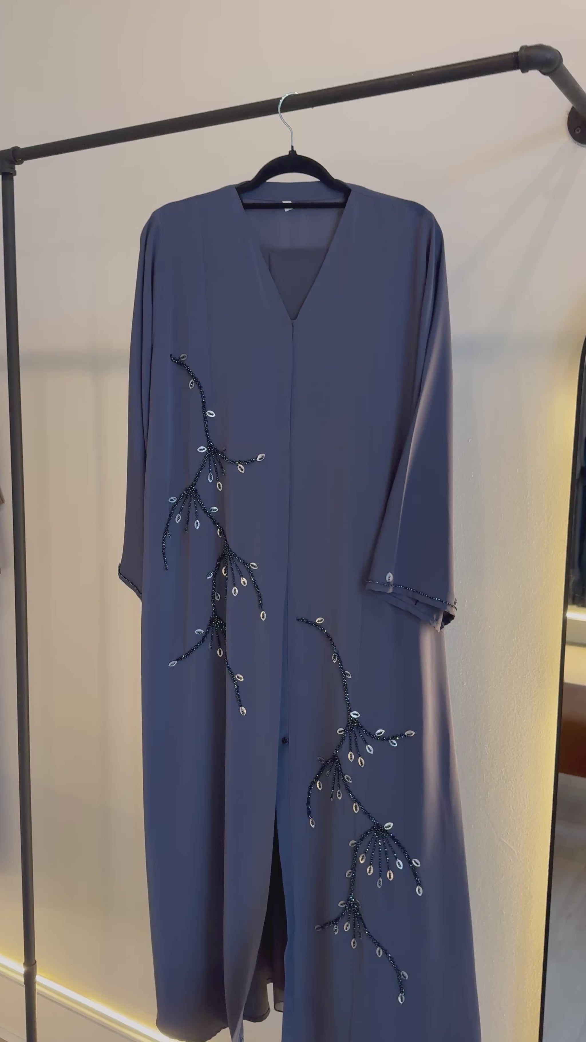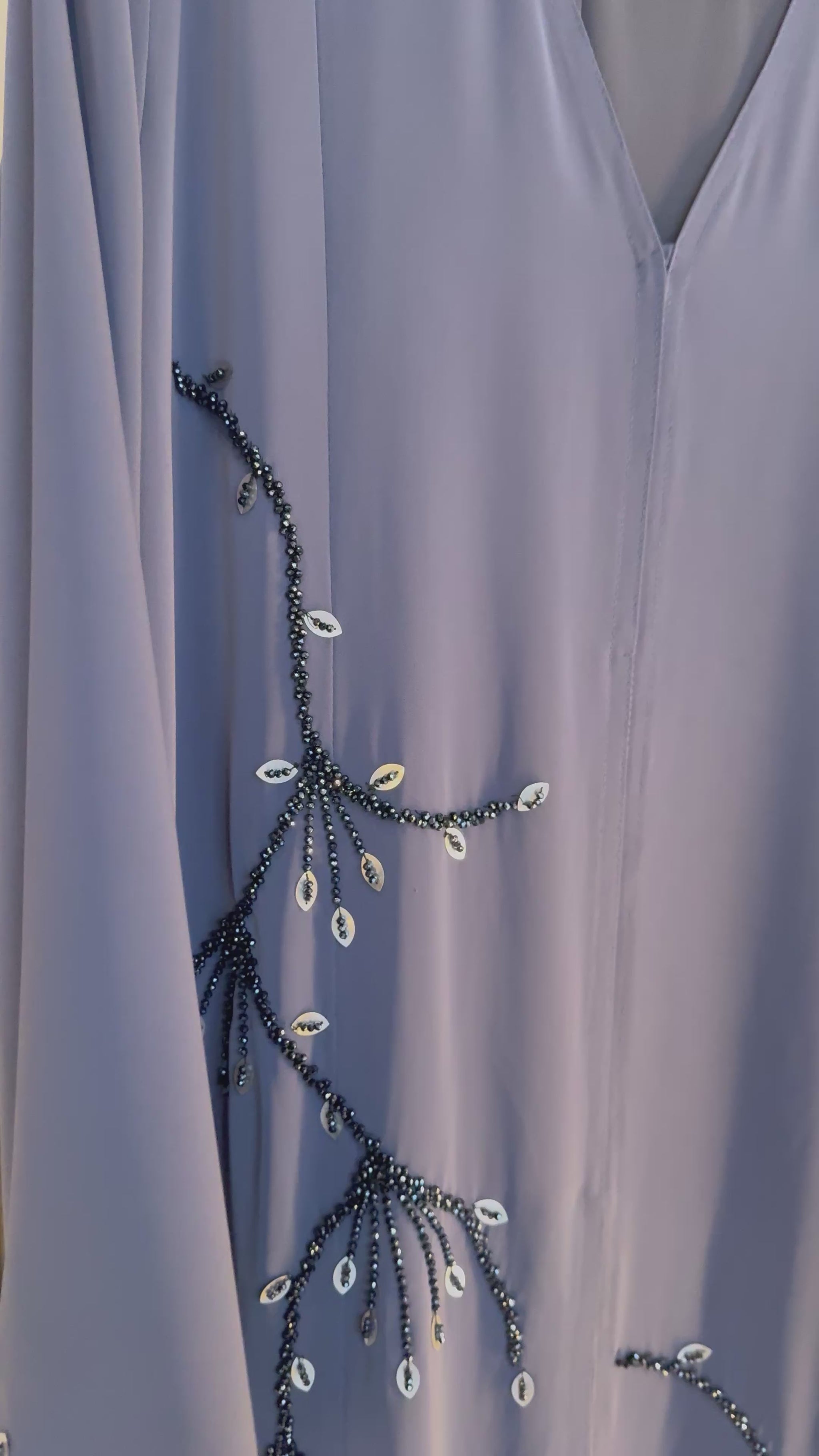 Lightweight crepe abaya, with embroidered beading in front. Four buttons to close.