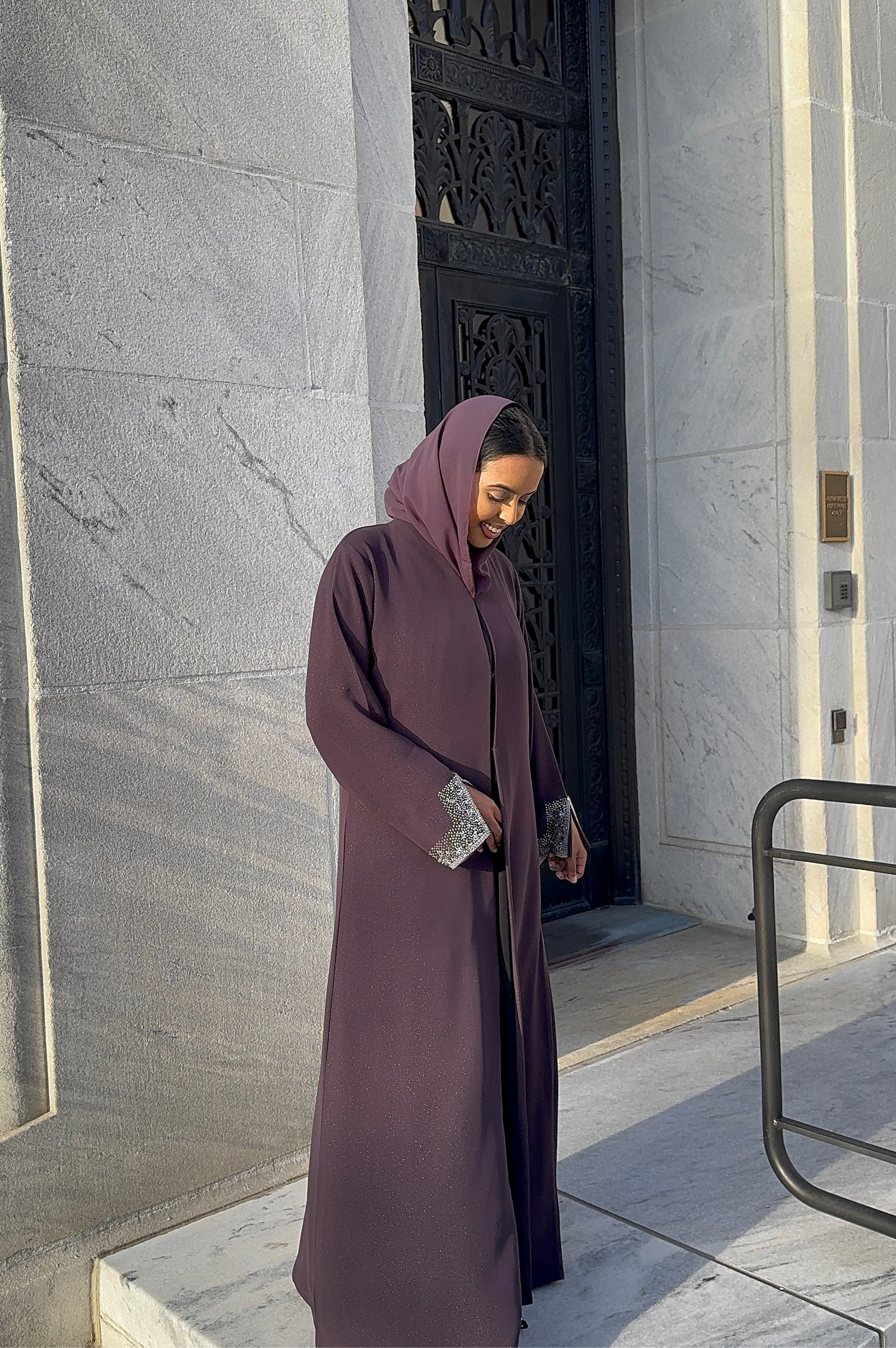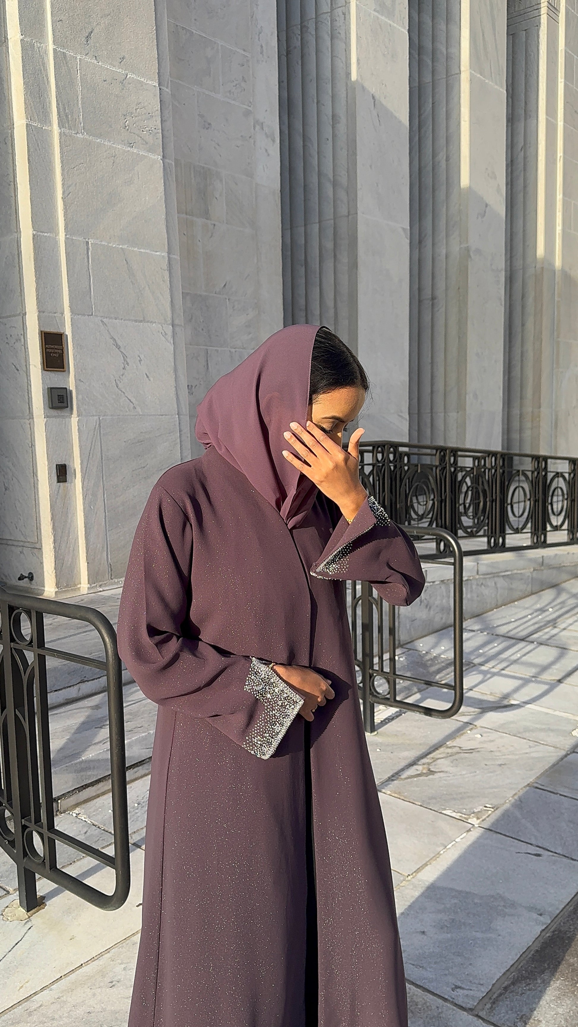 A subtle sparkly crepe abaya with hand stitched crystal rhinestones on the sleeves. Three buttons In the front. Fabric is cotton crepe, medium weight. *Open abaya*
