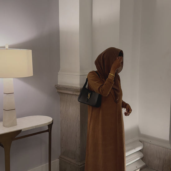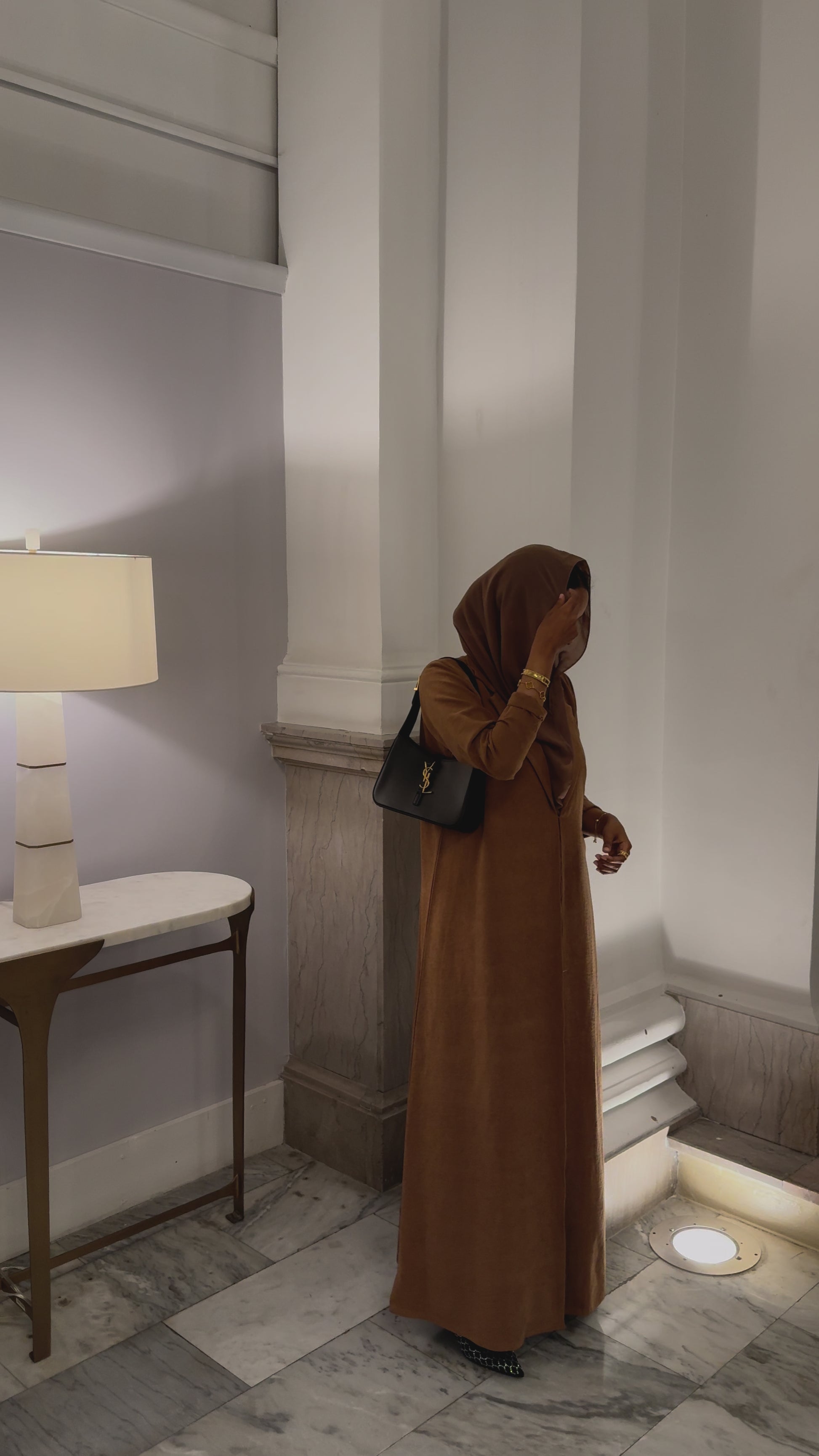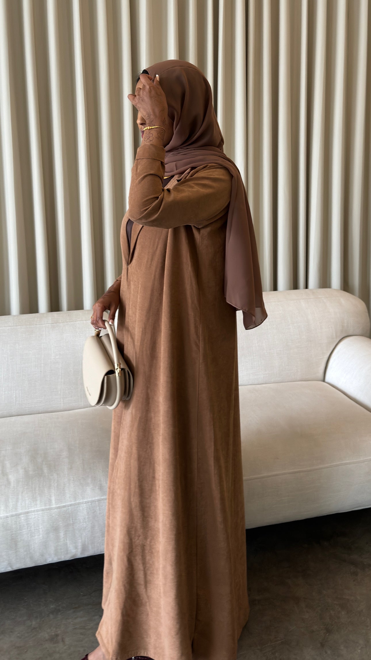 Straight cut suede abaya with 1 button in the front, fitted sleeves. Material has a light stretch.